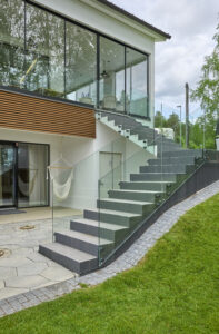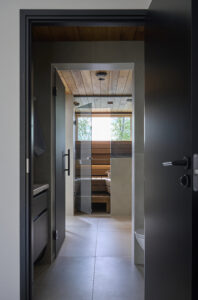 – Keittiöön haluttiin ehdottomasti aamuaurinkoa. Aurinko nousee tontin reunalta ja kiertää päivän mittaan paistamaan järven päälle, suoraan kohti taloa. Huoneet, jonne ei kaivattu valoa, sijoitettiin alakertaan, toiselle puolelle taloa. Loput toiveet olivat hyvin käytännönläheisiä kuten, että kodinhoitohuoneessa tulisi olla oma sisäänkäyntinsä.