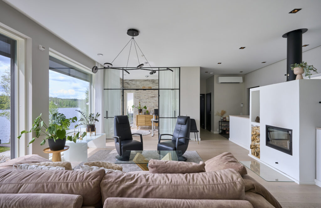 Olohuoneen näyttävä valaisin on Valaisin Grönlundin Arm-valaisin, joka sopii täydellisesti yhteen viereisten mustaraamisten lasiovien kanssa.
