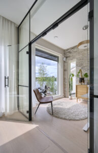 – Sisustusvalintoja määritteli paljon ikkunoista avautuva maisema, joka vaihtuu vuodenaikojen mukaan ja on hyvin tärkeä osa kotia. Ikkunat ja niiden näkymät olivat myös yksi koko arkkitehtuurin lähtökohdista.
